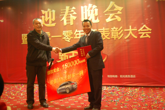 練祖耀(圖右),男,27歲,2009年9月加入青龍營銷團(tuán)隊(duì),經(jīng)過自己勤奮學(xué)習(xí),積極進(jìn)取,2010年個(gè)人業(yè)績(jī)榮膺榜首,獲青龍"優(yōu)秀業(yè)務(wù)員"稱號(hào),年終青龍董事長(zhǎng)宋敦清先生(圖左)獎(jiǎng)其現(xiàn)金15萬和價(jià)值10萬元小車一輛。
