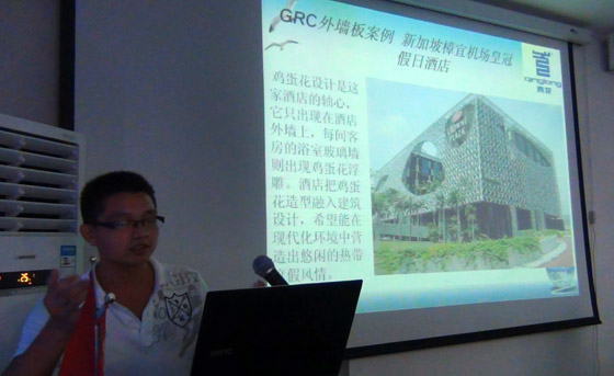 在培訓(xùn)會(huì)上,蘇小麗全面地介紹了公司生產(chǎn)的各類(lèi)藝術(shù)產(chǎn)品,并對(duì)它們的生產(chǎn)工藝、安裝細(xì)節(jié)及應(yīng)該注意的問(wèn)題進(jìn)行了詳細(xì)的解說(shuō)。龍江則主講《GRC在現(xiàn)在工程中的應(yīng)用》,從GRC外墻板、裝飾構(gòu)件以及園林景觀方面的案例出發(fā),向與會(huì)的人員展現(xiàn)了GRC在工程中的魅力。不少參加會(huì)議的人員都表示受益匪淺,“現(xiàn)在對(duì)公司生產(chǎn)的產(chǎn)品有了一個(gè)系統(tǒng)的了解,在GRC的安裝工藝方面也增長(zhǎng)了不少見(jiàn)識(shí),相信對(duì)以后的工作會(huì)有很大的幫助?!?/DIV>
