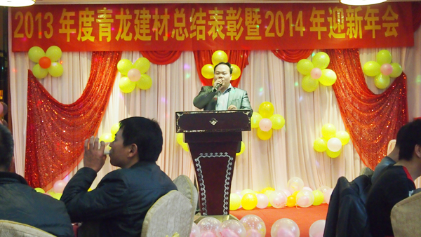 晚宴上,青龍廣西分公司韋流武先生代表集團(tuán)董事長(zhǎng)宋總致晚宴開(kāi)幕辭并送上新年祝福。韋經(jīng)理總結(jié)了2013年青龍廣西化學(xué)建材的發(fā)展歷程,肯定了2013年所取得的成績(jī),并對(duì)2014年寄予了美好展望。之后對(duì)2013年青龍廣西化學(xué)建材表現(xiàn)優(yōu)異的員工進(jìn)行表彰,鼓勵(lì)大家向他們學(xué)習(xí),繼續(xù)為生產(chǎn)中國(guó)較好的防水材料而奮斗。