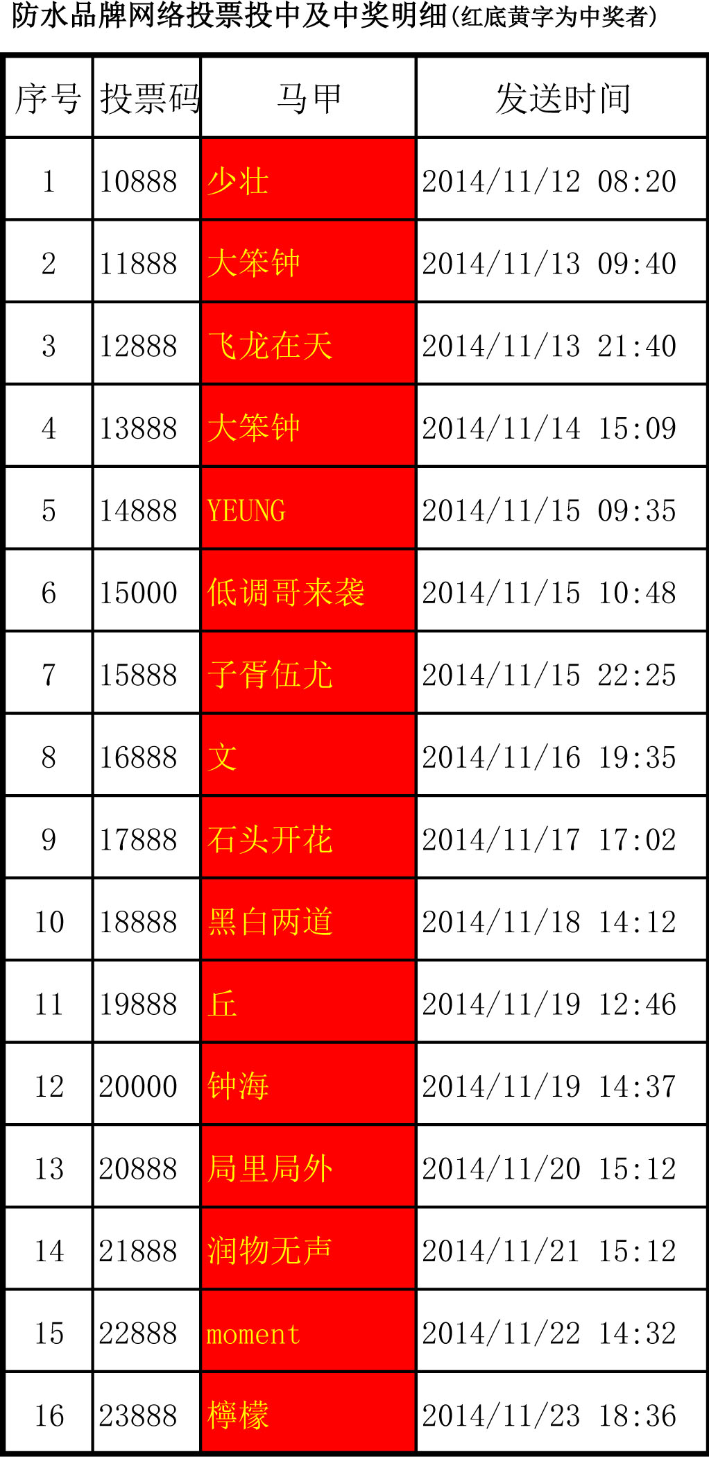 前16項(xiàng)投中及中獎(jiǎng)名單公布如下:少壯、大笨鐘、飛龍?jiān)谔臁⒋蟊跨?、YEUNG、低調(diào)哥來(lái)襲、子胥伍尤、文、石頭開(kāi)花、黑白兩道、丘、鐘海、局里局外、潤(rùn)物無(wú)聲、moment、檸檬。恭喜他們,也請(qǐng)大家繼續(xù)支持青龍,只為青龍投票!